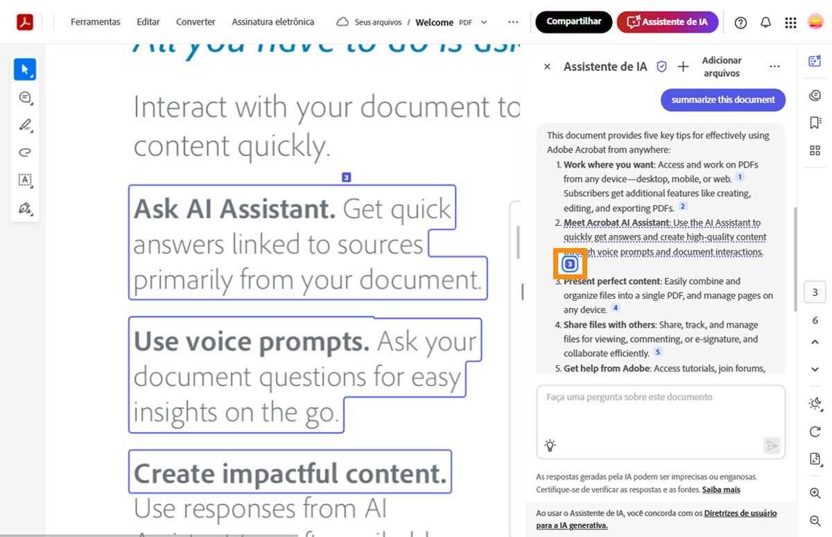 A resposta à sua pergunta é exibida. As fontes relevantes são marcadas com números. Você pode fazer o seguinte: - Selecione um número para navegar diretamente para a seção correspondente do documento. Se houver vários arquivos, passe o mouse sobre o número para mostrar a visualização do documento referenciado.