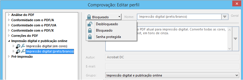 Para bloquear o perfil antes de exportá-lo, selecione Bloqueado no menu suspenso da caixa de diálogo Perfil de edição de comprovação. Também é possível selecionar Protegido por senha e inserir uma senha.