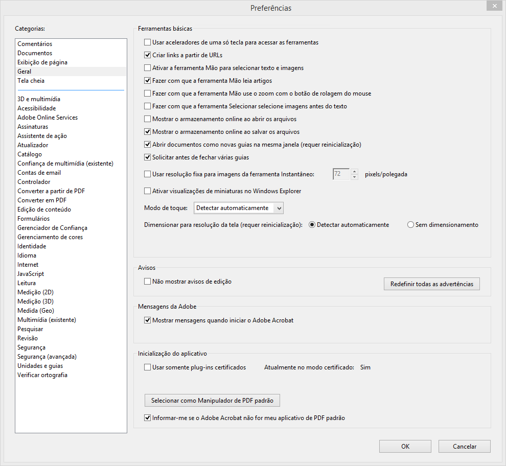 As configurações de preferências controlam o comportamento do aplicativo sempre que este é utilizado; essas configurações não estão associadas a nenhum documento PDF específico. Para acessar a caixa de diálogo de preferências, clique no menu de opções (Windows) > Preferências ou Acrobat/Adobe Acrobat Reader > Preferências(macOS).