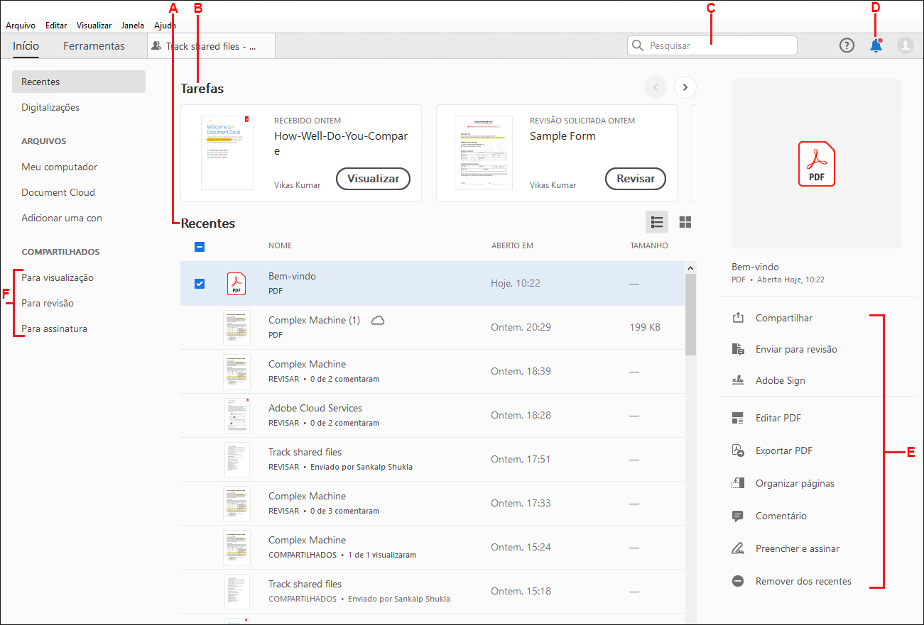• Receber notificações: Alerta você sobre quaisquer alterações de status em documentos compartilhados, incluindo solicitações de visualização, revisão e assinatura. Verifique as notificações do Acrobat para obter mais informações.