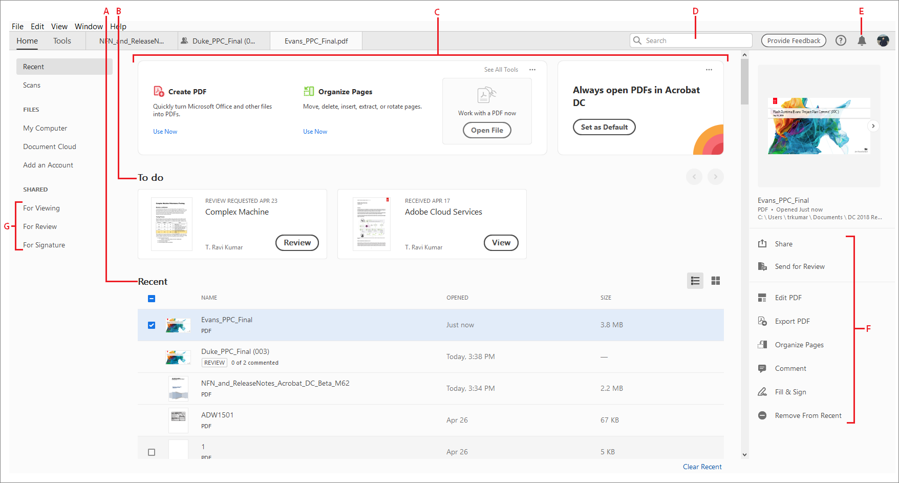 Na visualização inicial, você pode acessar: A. Menu do aplicativo B. Criar um PDF C. Ajuda D. Notificações E. Conta da Adobe F. Todas as ferramentas G. Visualização em lista H. Visualização em miniaturas I. Menu da página inicial