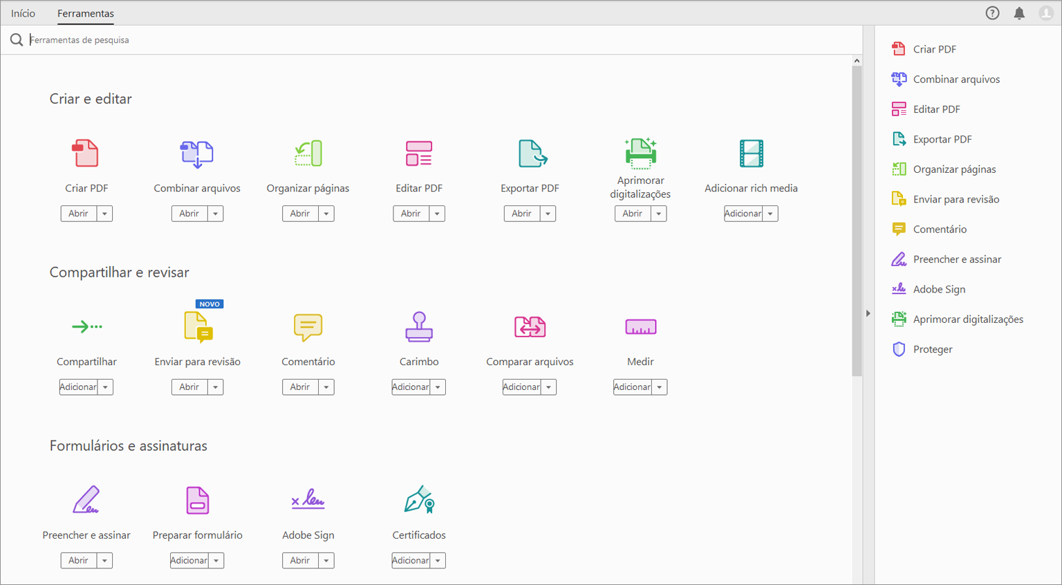 • Exibição de todas as ferramentas: navegue pela lista de todas as ferramentas disponíveis no Acrobat.