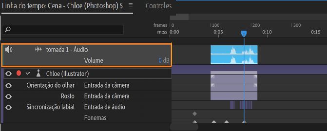 Você pode alterar a velocidade e a ordem das marionetes, as tomadas gravadas e o áudio para ajustar seu trabalho. As marionetes e o áudio aparecem como itens de faixa (barras maiores) e as tomadas gravadas aparecem como barras menores sob os itens de faixa da marionete. Também é possível aumentar ou diminuir o zoom do tempo para facilitar o acesso às barras de faixa ou uma visão geral temporal da cena.