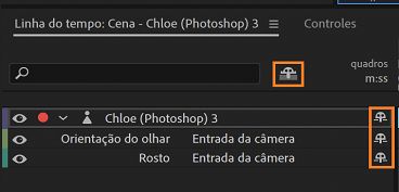 Os itens de faixa selecionados são exibidos em azul sólido no painel Linha do tempo. Quando uma barra de tomada ou projeção de uma marionete é selecionada (selecionada diretamente ou depois de gravar tomadas), a barra torna-se azul sólido. A faixa de marionete é destacada em azul para indicar que algo na hierarquia de marionetes está selecionado. Essa seleção hierárquica também permite que os parâmetros de comportamento da marionete fiquem visíveis no painel Propriedades e sejam modificados imediatamente após ajustar as tomadas.