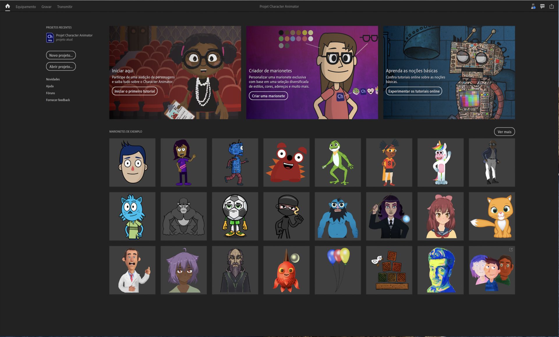 O espaço de trabalho Equipamento permite editar a estrutura da marionete. Você pode adicionar ou modificar comportamentos, reorganizar as camadas de marionetes, adicionar alças a uma marionete e modificar acionadores do teclado. Para acessar o espaço de trabalho, siga um destes procedimentos: