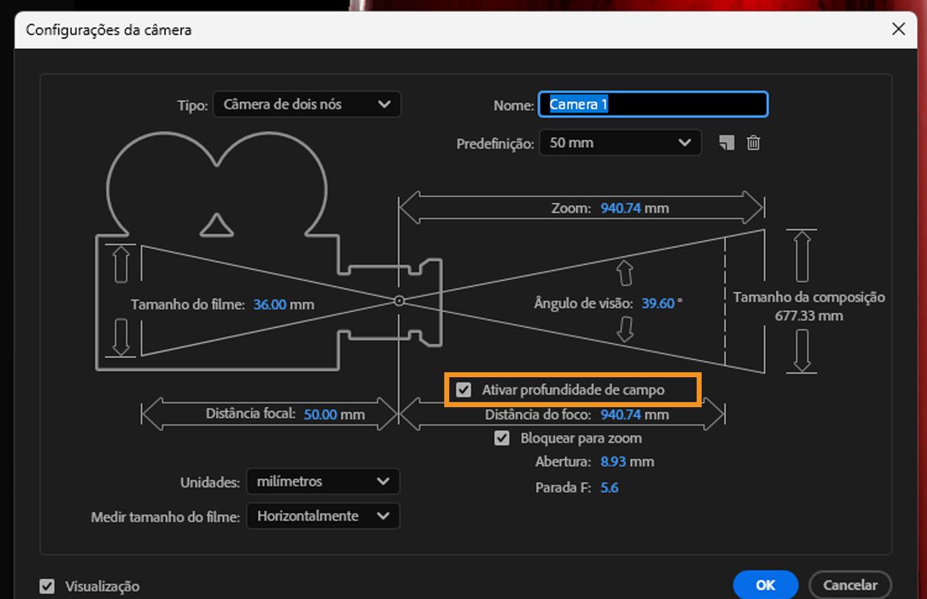 Na caixa de diálogo Configurações da câmera, selecione a opção Habilitar profundidade de campo.