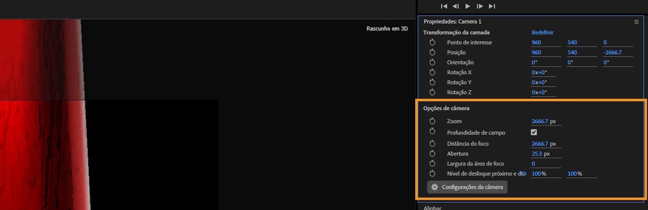 - Ajustar as Configurações Padrão da Câmera para composições 3D