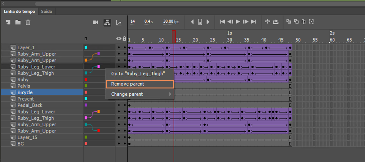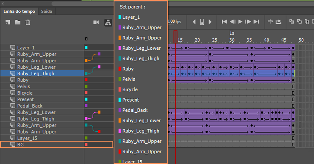 O Anime permite configurar uma camada como pai de outra. O recurso pai da camada é uma maneira fácil de permitir que uma camada/objeto de sua animação controle outra camada/objeto. Como designer da animação ou um designer de jogo, você pode acelerar o tempo de animação, pois é possível controlar movimentos de diferentes partes de um personagem com mais facilidade.