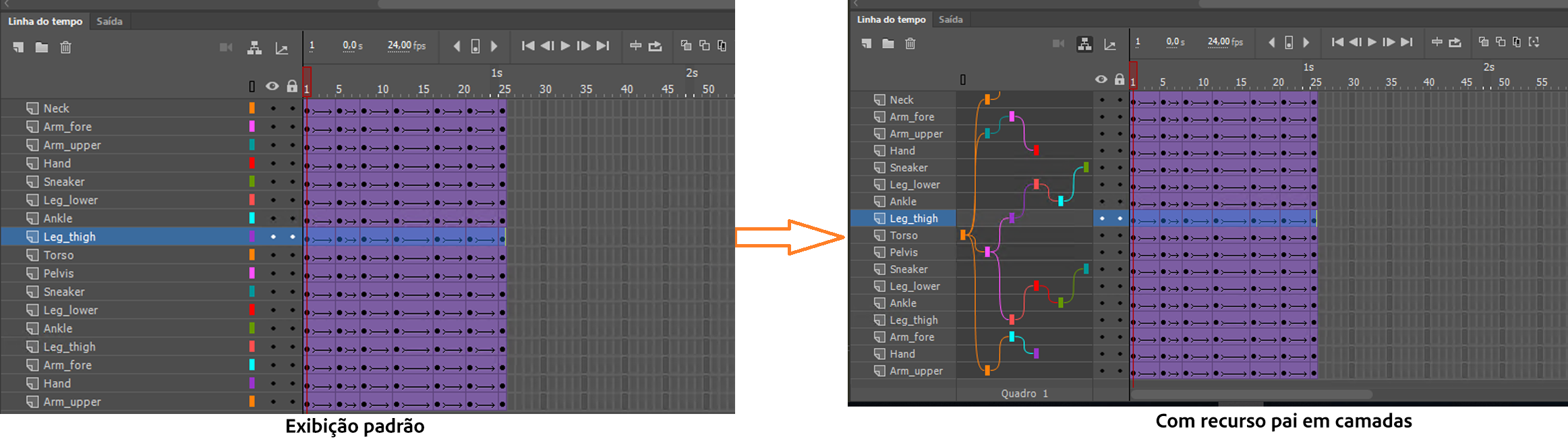 Nas capturas de tela abaixo, você pode ver as visualizações de hierarquia antes e depois, além das posições das camadas quando você usa o recurso pai da camada.