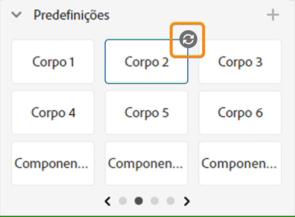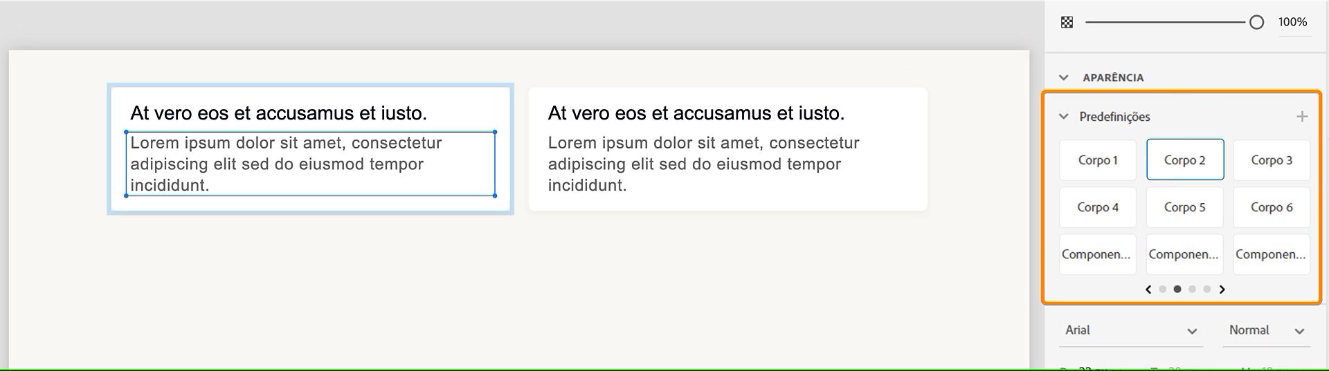 No painel Predefinições, selecione uma predefinição de texto, por exemplo, Corpo 2.