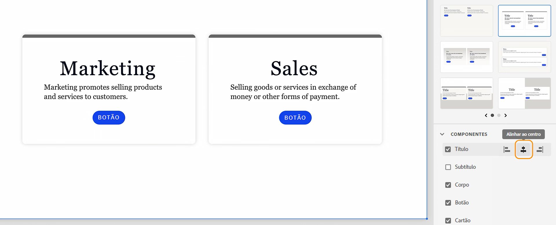 Altere o alinhamento do título, do subtítulo, do corpo ou do botão. Para alterar o alinhamento (esquerda, centro ou direita), passe o mouse sobre o título e selecione o alinhamento necessário.