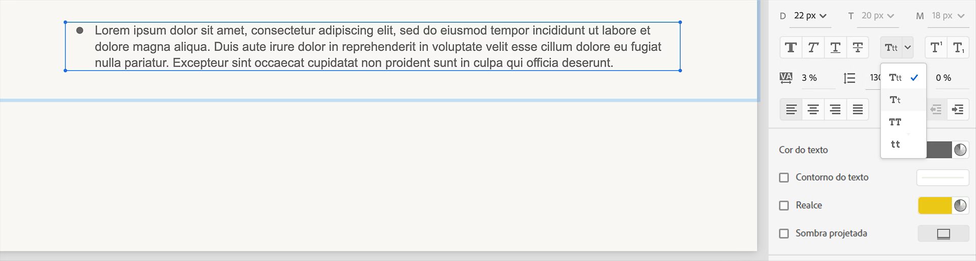 Altere as propriedades do texto selecionado, como família de fontes, tamanho, cor ou espaçamento.