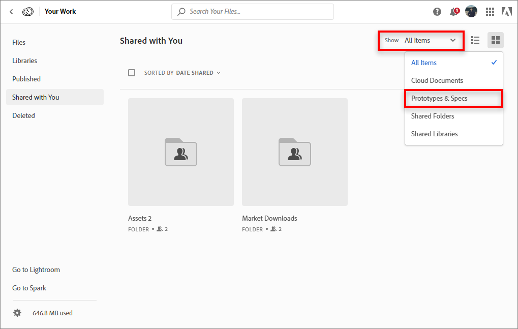 - Os destinatários receberão o convite para revisar o documento por email e uma notificação dentro do aplicativo.Eles podem acessar os documentos compartilhados no aplicativo da Creative Cloud selecionando Arquivos > Compartilhado com você.