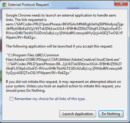 O site da Creative Cloud usa um protocolo personalizado, aam://, para abrir o aplicativo de desktop Creative Cloud no computador. Permitir que um site abra um programa em seu computador pode causar danos. Portanto, seu navegador solicita que você confirme se deseja fazê-lo.