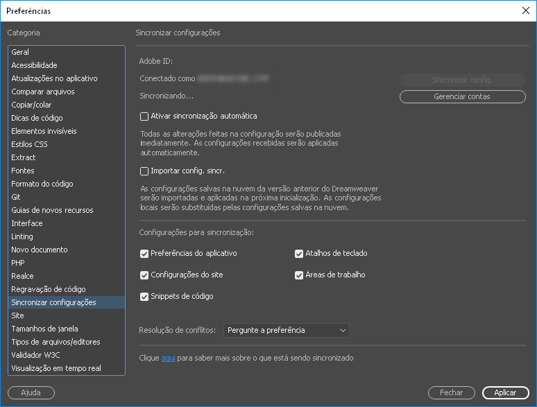 Sincronizar as configurações do Dreamweaver com a Creative Cloud