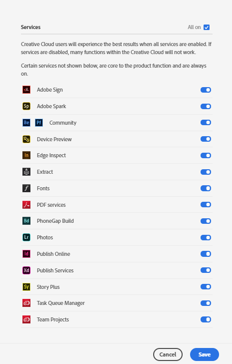 Habilite todos os serviços para obter a melhor experiência da Creative Cloud. Desative os serviços apenas quando necessário para conformidade ou aplicação de políticas, pois isso pode limitar a funcionalidade dos aplicativos da Adobe.