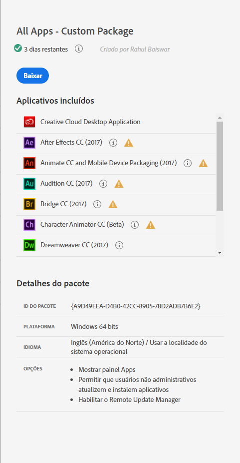 Para obter mais informações sobre cada aplicativo desatualizado no pacote, passe o mouse sobre o símbolo de aviso, à direita do nome do aplicativo.