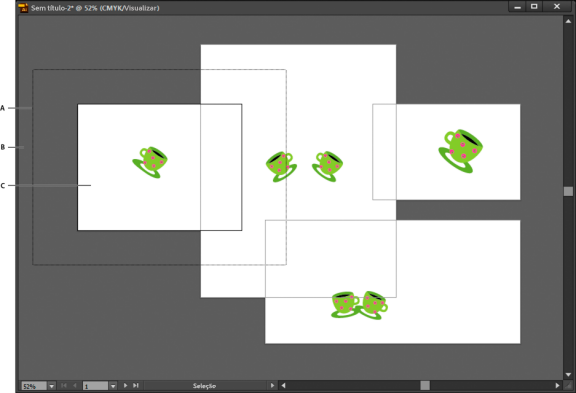 Cada prancheta é delimitada por linhas sólidas e representa a área máxima imprimível. Para ocultar os limites da prancheta, escolha Exibir > Ocultar pranchetas. A tela de desenho é a área fora da prancheta que se estende até a borda da janela de 220 polegadas quadradas. A tela de desenho representa um espaço no qual você pode criar, editar e armazenar elementos de trabalhos artísticos antes de movê-los para uma prancheta. Os objetos inseridos na tela de desenho são visíveis na tela, mas não são impressos.