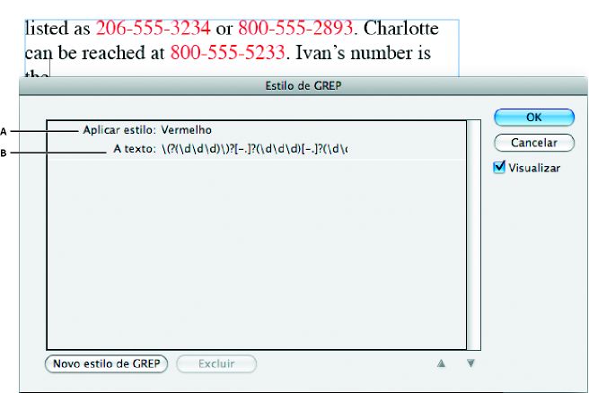 GREP é uma técnica de pesquisa avançada, baseada em padrões. Você pode usar estilos de GREP para aplicar um estilo de caractere ao texto que esteja de acordo com a expressão GREP especificada. Por exemplo, suponha que você queira aplicar um estilo de caractere a todos os números de telefone do texto. Ao criar um estilo de GREP, você seleciona o estilo de caractere e especifica a expressão GREP. Todo o texto do parágrafo correspondente à expressão GREP será formatado com o estilo de caractere.