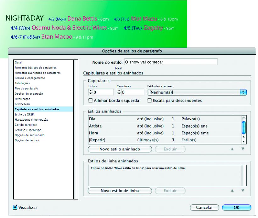 Na seção ou na caixa de diálogo 'Capitulares e estilos aninhados', clique em 'Novo estilo aninhado' (ou 'Novo estilo de linha aninhado') no mínimo duas vezes e escolha as configurações para cada estilo.