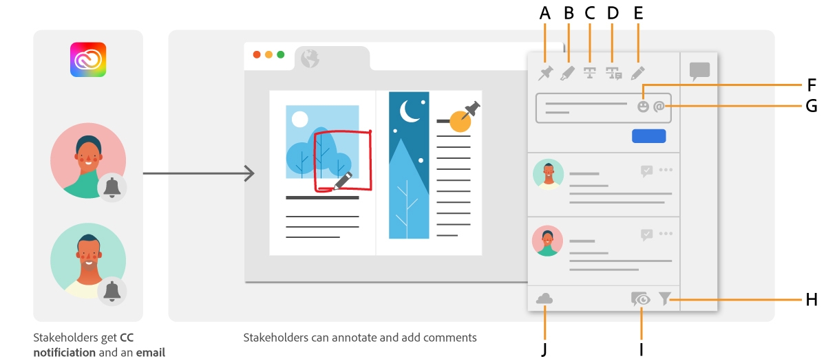 O InDesign inclui ferramentas de comentário intuitivas que colaboradores podem usar para compartilhar feedback. Como um colaborador, você pode revisar o documento compartilhado ao receber: