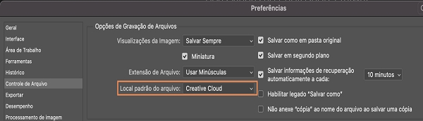 Você pode alterar o local padrão de salvamento para seu computador ou para a Creative Cloud. Selecione Editar > Preferências > Manipulação de arquivos (Windows) ou Photoshop > Preferências > Manipulação de arquivos (macOS), depois escolha sua opção preferida em Local padrão do arquivo e selecione OK.