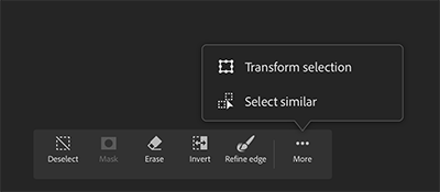 - Quando a seleção estiver concluída, você poderá ver a barra de propriedades de seleção ativa na parte inferior do seu espaço de trabalho. Você também pode optar por Desmarcar, Mascarar, Apagar, Inverter, Refinar borda, Transformar seleção ou Selecionar semelhante.