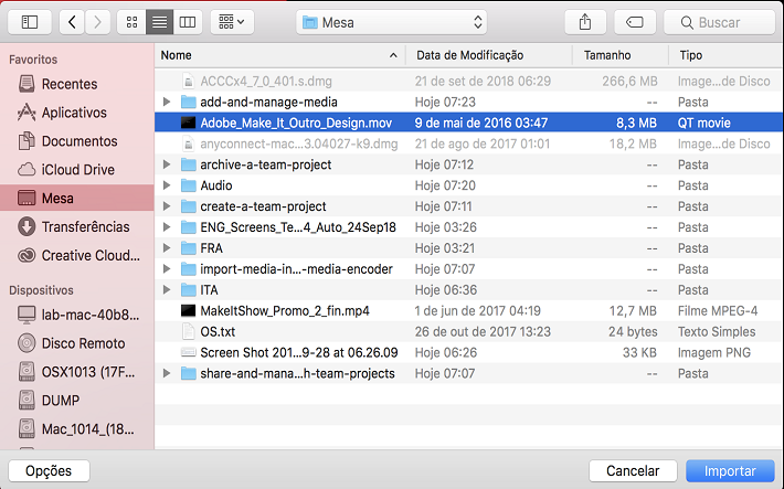 Para importar a mídia em um projeto de equipe: