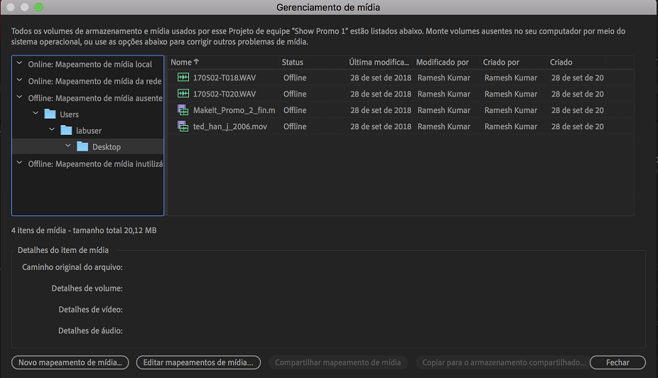 A mídia usada no seu projeto de equipe permanece em seu computador local. Compartilhe ativos com a sua equipe usando a Creative Cloud Assets, o armazenamento compartilhado de rede ou uma opção de armazenamento em nuvem alternativa. Se alguma mídia estiver ausente, escolha Editar > Team Project > Gerenciamento de mídia no menu principal para acessar a ferramenta de gerenciamento de mídia.
