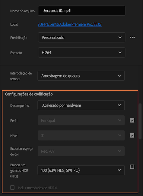 Para usar a codificação de hardware para arquivos H.264 e HEVC durante a exportação, selecione esta opção na caixa de diálogo Exportar. Se o hardware não for compatível, você verá apenas a codificação de software.