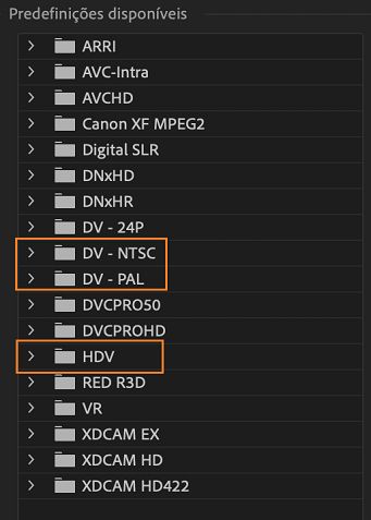 É possível editar gravações em HDV ou gravações em HD em 720p, 1080p ou 1080i. Ao criar uma sequência para esses formatos, selecione a predefinição que melhor corresponde às especificações da gravação de origem.