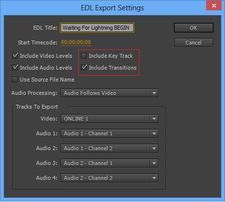 Para exportar uma EDL sem transições ou clipes principais, desmarque Incluir transições ou Incluir faixa principal. As transições e os clipes V2 são mantidos na sequência.