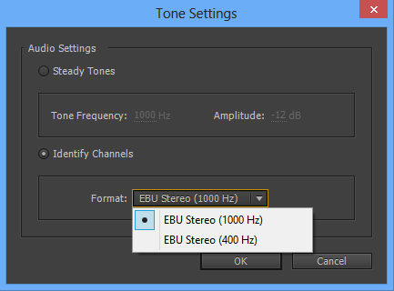 O Premiere Pro fornece uma nova caixa de diálogo Configurações de tom, que permite criar clipes de Barras e tons com amplitude de -20 dB.