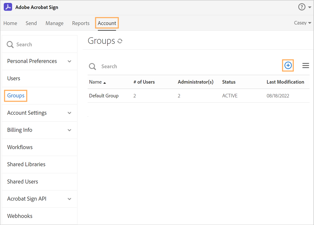 Crie um grupo e um usuário no Adobe Acrobat Sign
