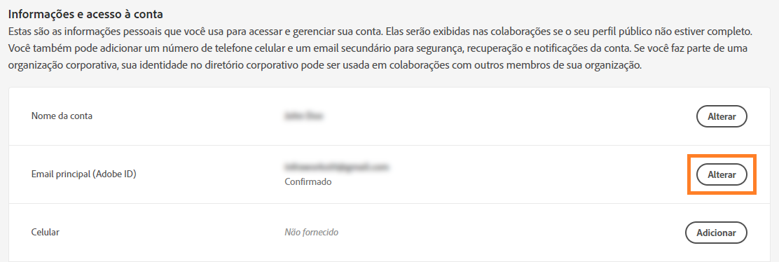 Na seção Informações e acesso à conta, altere seu endereço de email existente para um endereço de email diferente, porém válido.