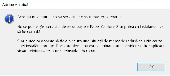 Când încercați să aplicați recunoașterea optică a caracterelor (OCR) asupra unui fișier, obțineți mesajul de eroare, „Acrobat nu a putut accesa serviciul de recunoaștere deoarece: nu se poate găsi serviciul de recunoaștere a textului de pe hârtie.”
