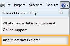 Din Internet Explorer, selectați Ajutor > Despre Internet Explorer. (În anumite versiuni ale Internet Explorer, selectați semnul de întrebare din colțul de dreapta sus pentru a selecta Despre Internet Explorer.)