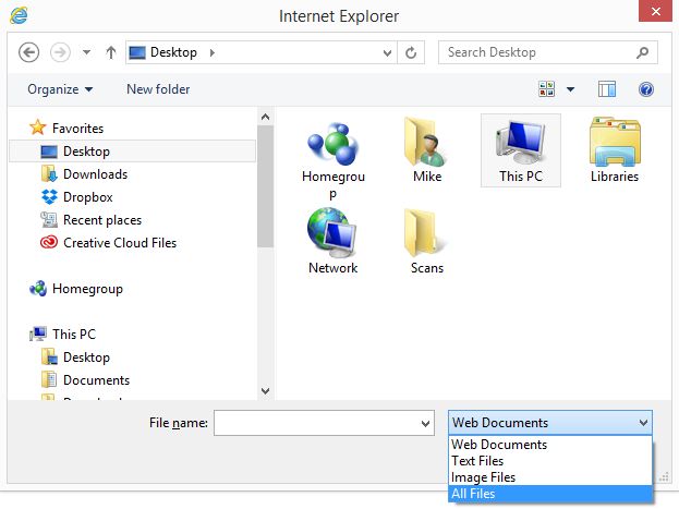(Numai Windows) Din meniul Fișiere de tip, selectați Toate fișierele.