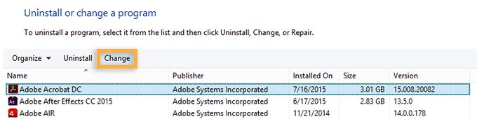 De asemenea, puteți repara instalarea Acrobat sau Reader folosind Panoul de control al Windows.