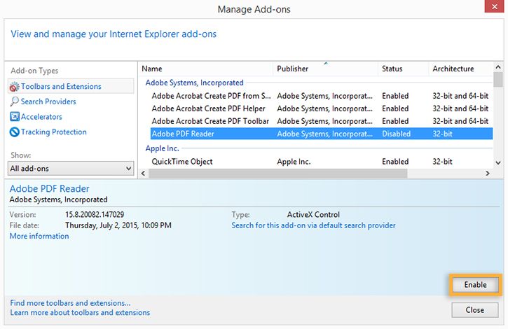 Activați add-on-ul Adobe PDF pentru browser (Internet Explorer 8 și versiuni mai recente)