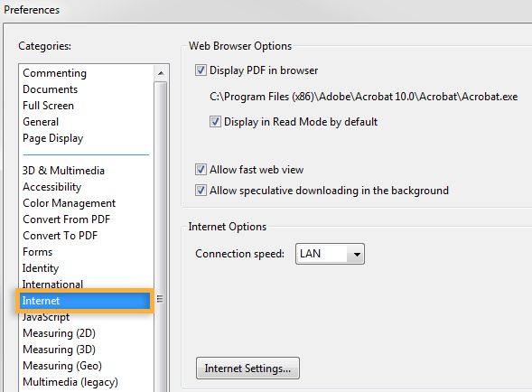Acrobat sunt Reader aplicații pe 32 biți pe Windows.Dacă încercați să deschideți un PDF într-o versiune pentru 64 biți a Internet Explorer, PDF-ul se deschide în versiunea independentă a Acrobat sau Reader și nu în Internet Explorer.