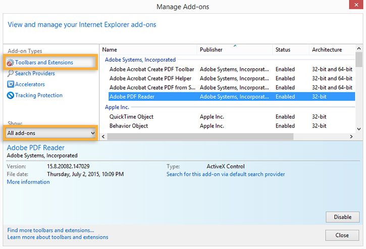 Din lista de add-on-uri, selectați Adobe PDF Reader.