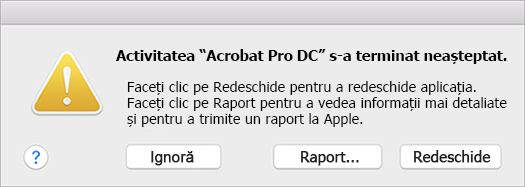 Dacă aplicația Acrobat/Reader se prăbușește frecvent, sunt necesare jurnale de avarie pentru a diagnostica problema. Jurnalele de blocare conțin informații despre ce făcea aplicația înainte de blocare. Ori de câte ori Acrobat/Reader se blochează pe Mac, generează automat un raport de avarie.