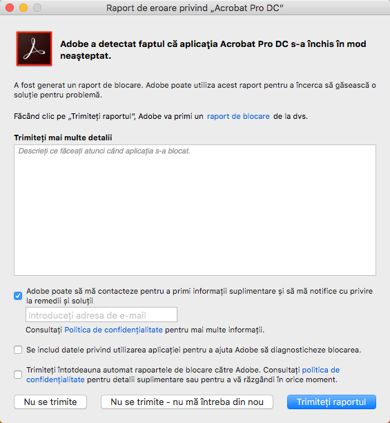 Când Acrobat se prăbușește, este afișat un dialog de avertizare care spune: „Acrobat Pro s-a închis pe neașteptate”. Raportul de avarie poate fi citit imediat când faceți clic pe butonul Raportare....