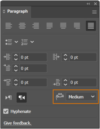Select the paragraph and from the Paragraph panel (Window > Type > Paragraph), choose a setting from the Insert Kashida drop-down list. The options available are: None, Short, Medium, Long, or Stylistic. Kashidas are only inserted if the paragraph is justified. This setting isn't applicable for paragraphs that have alignment settings.
