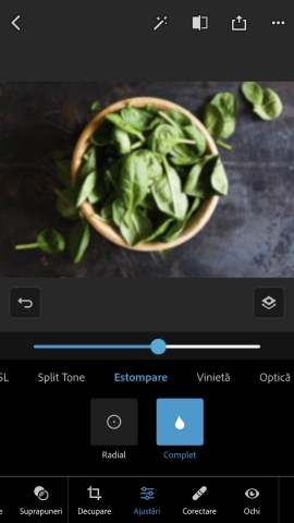 Photoshop Express vă permite să aplicați filtre instantanee numite Aspecte. Puteți alege dintr-o gamă de efecte atrăgătoare și puteți controla intensitatea acestora. Selectați efectul dorit pentru a-l aplica și reglați intensitatea acestuia cu ajutorul cursorului.