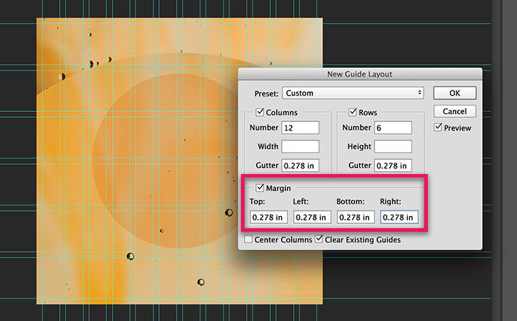 In the New Guide Layout dialog box, select the Margin option. Enter "0.278 in" (or 20px) for the Top, Left, Bottom, and Right margins (the same value you specified for Column and Row Gutters). The columns and rows shrink to accommodate the margins.