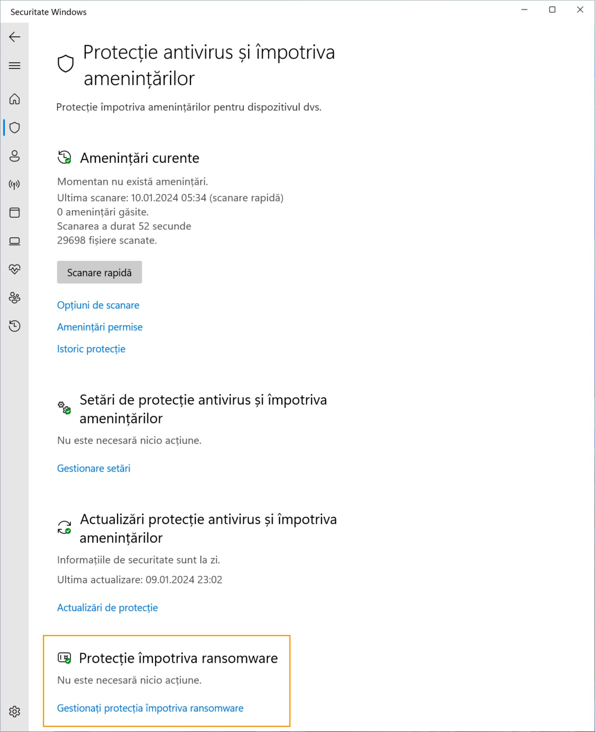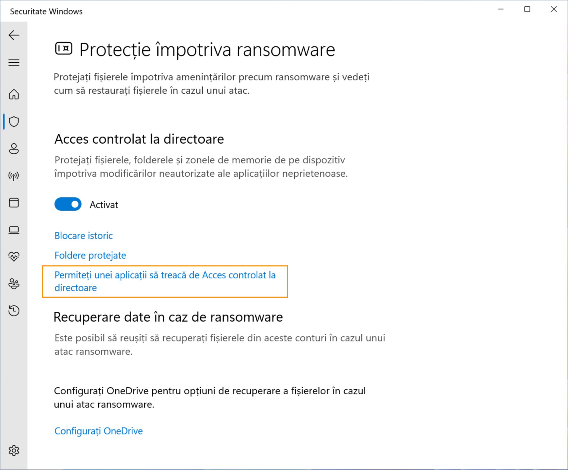 Sub secțiunea pentru setări de Protecție antivirus și împotriva amenințărilor, selectați Protecție împotriva ransomware.