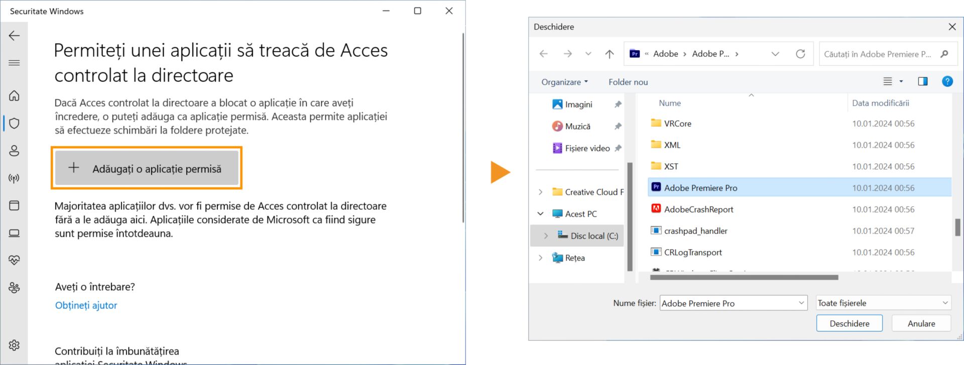 Pentru a preveni blocajele la lansare, Administratul trebuie să adauge Adobe Media Encoder, After Effects sau Premiere Pro la lista de excepții.