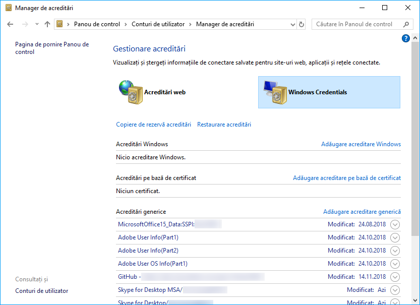 Navigați la Start > Panou de control > Conturi de utilizator > Manager de acreditări.